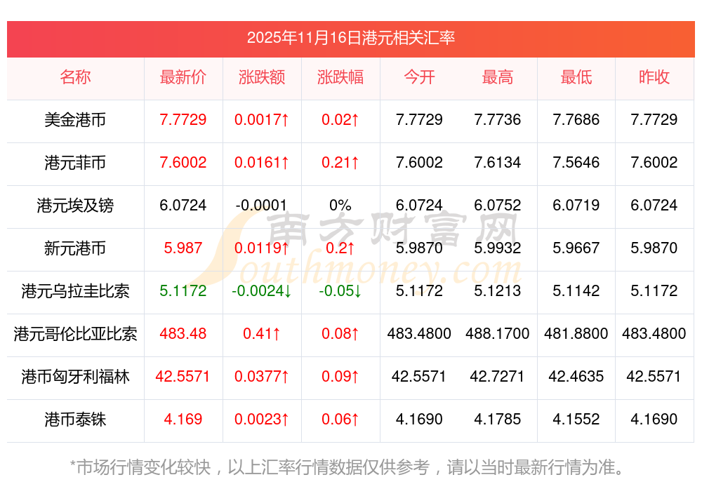 2025年11月16日最新消息,港元兌換蘭幣最新匯率為2.197700,今開為2.1977,昨收為2.1977,最高為2.2143,最低為2.1883。