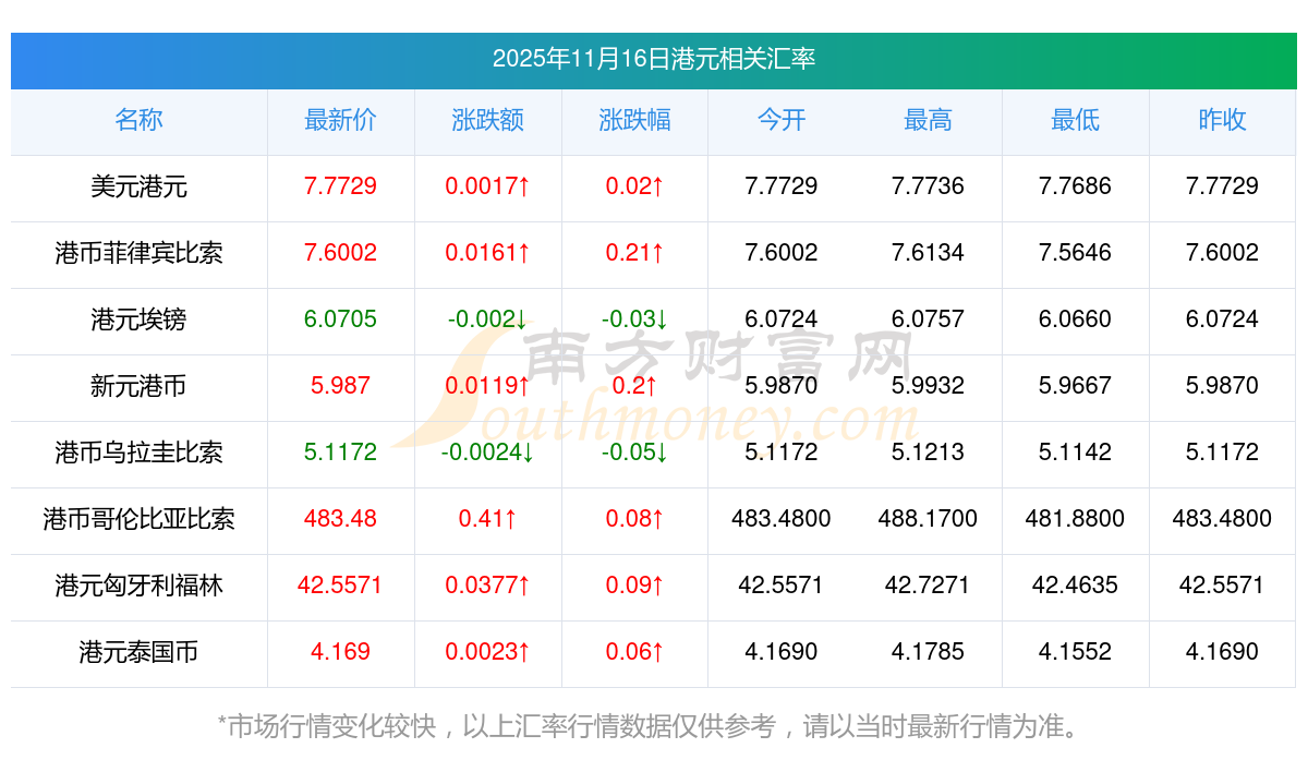 2025年11月16日港元相關(guān)匯率查詢