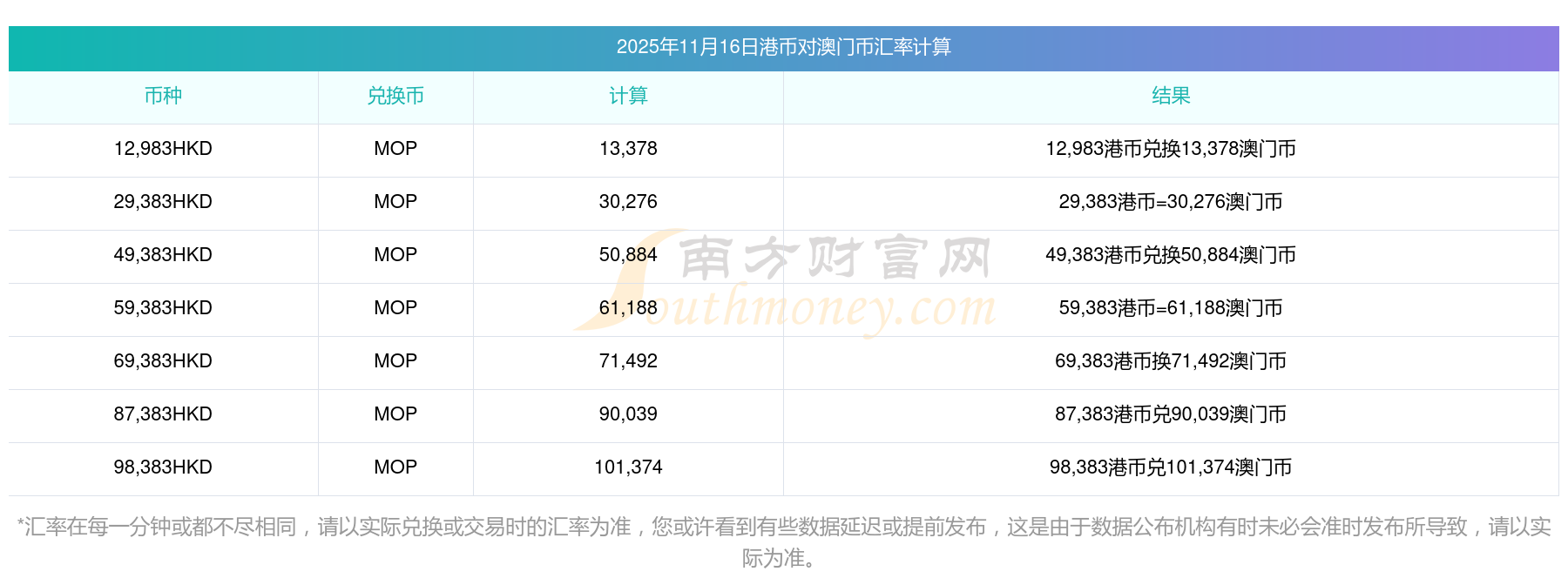 2025年11月16日,匯率換算:1港幣=1.0304澳門幣。舉例:假如一瓶礦泉水需要1港幣,則需澳門幣:1.0304澳門幣。