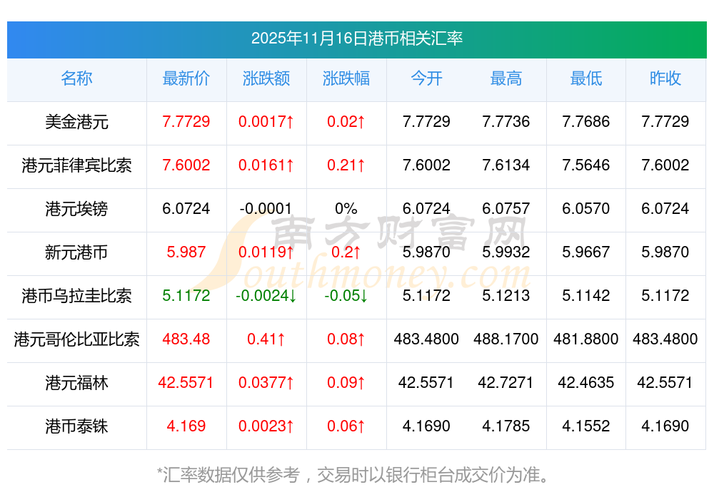 2025年11月16日港幣相關(guān)匯率查詢