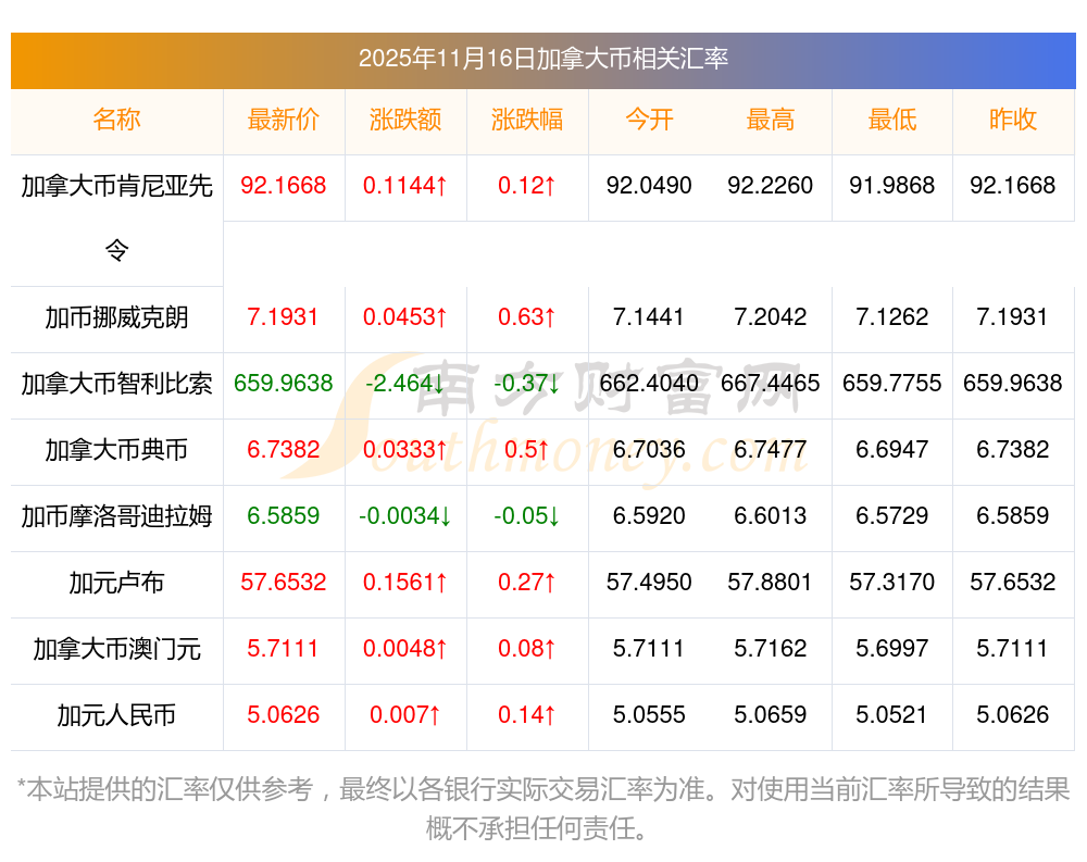 2025年11月16日加拿大幣相關(guān)匯率查詢(xún)