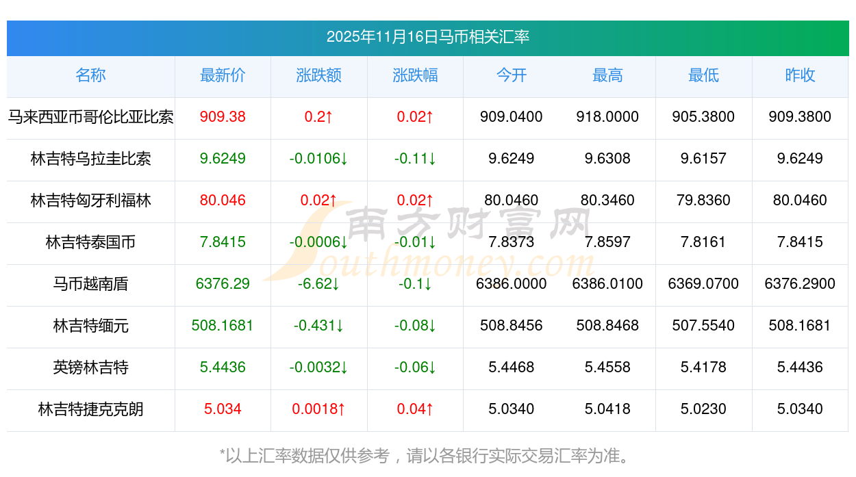 2025年11月16日馬幣兌換澳門元最新匯率:1.938100,今開:1.9381,昨收:1.9381,最高:1.9400,最低:1.9343。