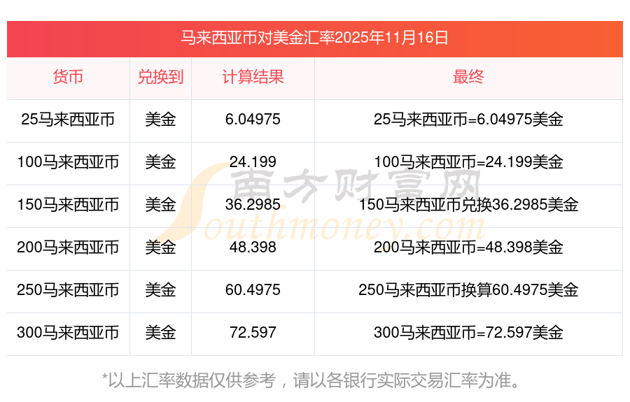 南方財富網(wǎng)為您提供馬來西亞幣對美金匯率最新價格詳情。
