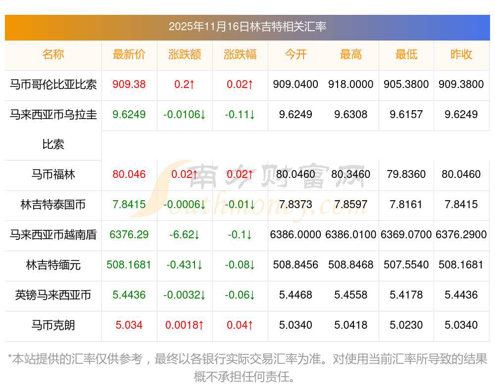 2025年11月16日林吉特相關匯率查詢