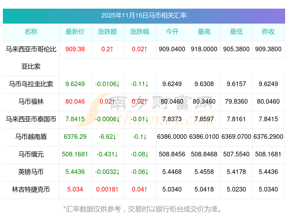 根據(jù)2025年11月16日匯率,馬幣兌換韓幣匯率最新價350.521690,今開價355.7013,昨收價350.5217,最高價357.1692,最低價350.2724。