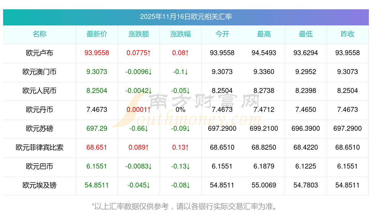 今日匯率歐元兌埃及鎊匯率行情2025-11-16