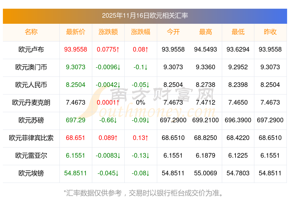 2025年11月16日歐元相關(guān)匯率查詢