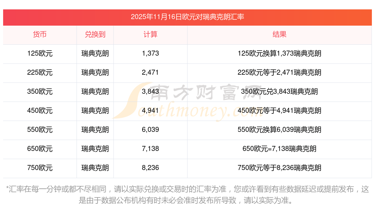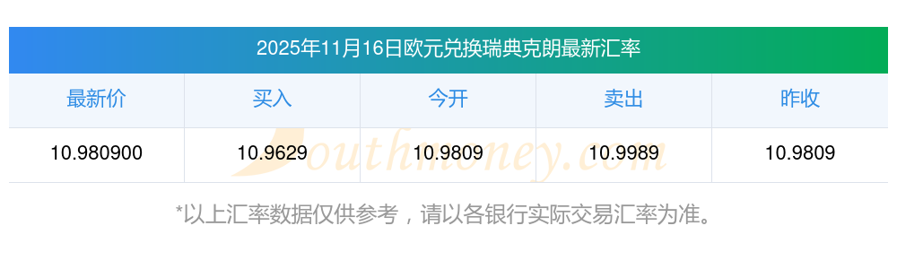 今日歐元匯價:2025年11月16日35歐元兌瑞典克朗匯價一覽表