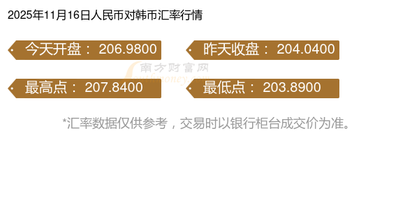 今日匯率2025年11月16日人民幣兌換韓幣匯價(jià)一覽