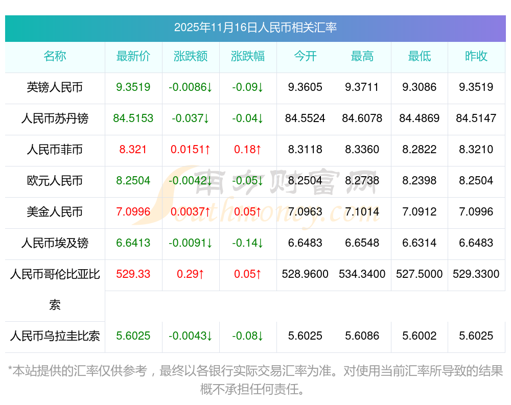2025年11月16日人民幣相關匯率查詢