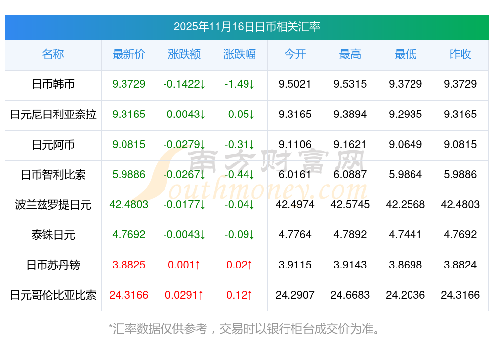 2025年11月16日日幣相關(guān)匯率查詢
