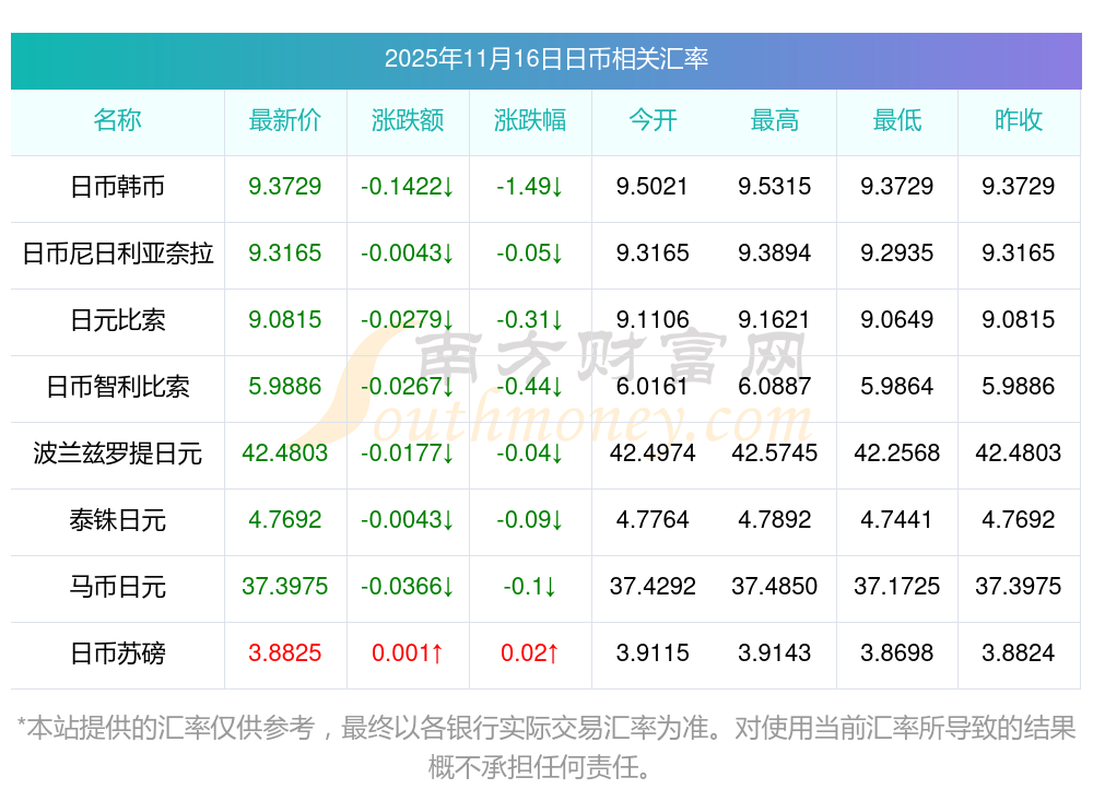 2025年11月16日日幣相關(guān)匯率查詢