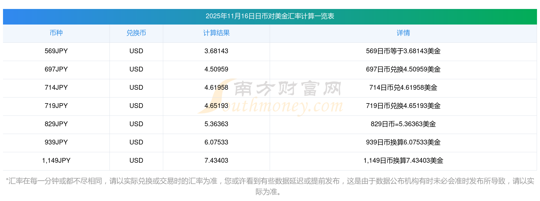2025年11月16日日幣與美金的兌換匯率計算如下: