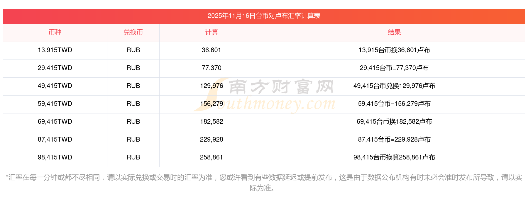 臺(tái)幣對(duì)盧布的購(gòu)匯匯率多少?2025年11月16日
