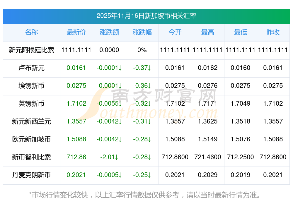 2025年11月16日新加坡幣相關(guān)匯率查詢