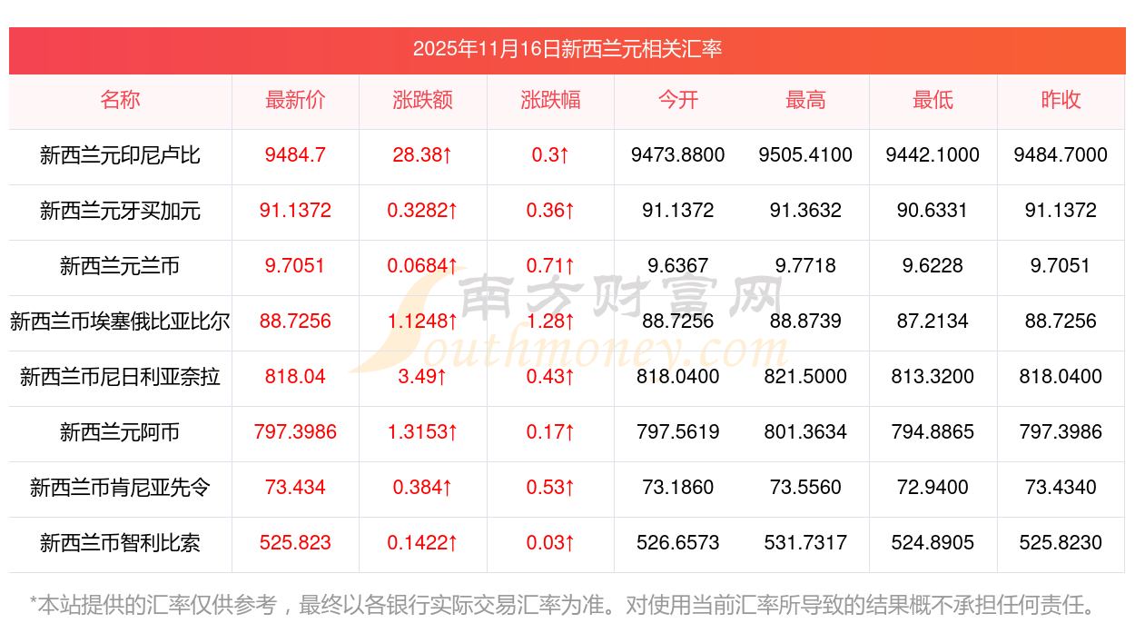 2025年11月16日新西蘭元相關(guān)匯率查詢