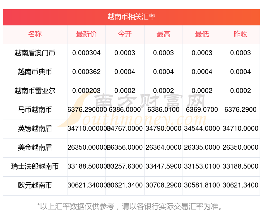 南方財(cái)富網(wǎng)為您提供越南幣對(duì)泰國(guó)幣匯率最新價(jià)格詳情。