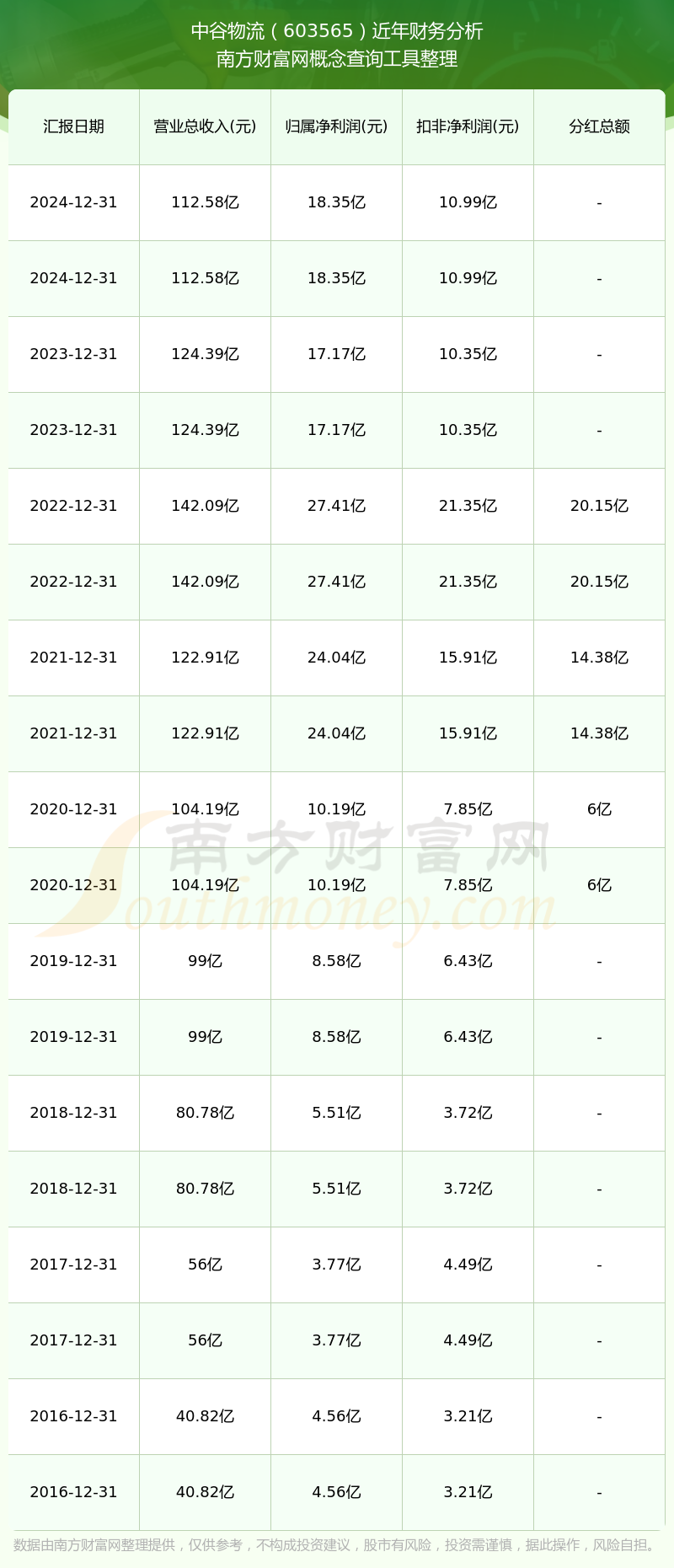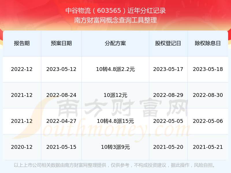 中谷物流最新一次公布的分紅方案為10轉(zhuǎn)4.8派2.2元。本次權(quán)益分派股權(quán)登記日為2023年5月17日,除權(quán)除息日為2023年5月18日,派息日為2023年5月18日。