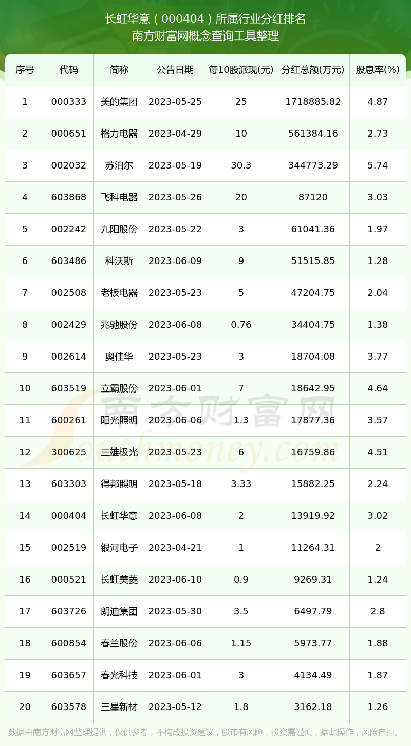 按照南方財富網(wǎng)趨勢選股系統(tǒng)統(tǒng)計,長虹華意所屬行業(yè)為家電行業(yè)行業(yè),家電行業(yè)行業(yè)分紅排名情況如下表: