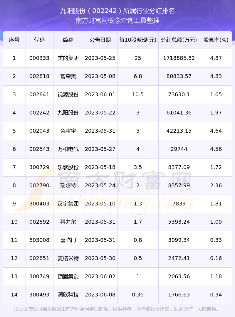 二、九陽(yáng)股份002242行業(yè)分紅排名
