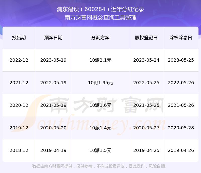 浦東建設最新一次公布的分紅方案為10派2.1元。本次權益分派股權登記日為2023年5月24日,除權除息日為2023年5月25日,派息日為2023年5月25日。