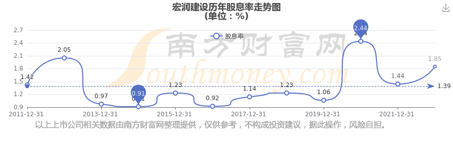 近年宏潤建設(shè)年度股息率走勢如下圖:
