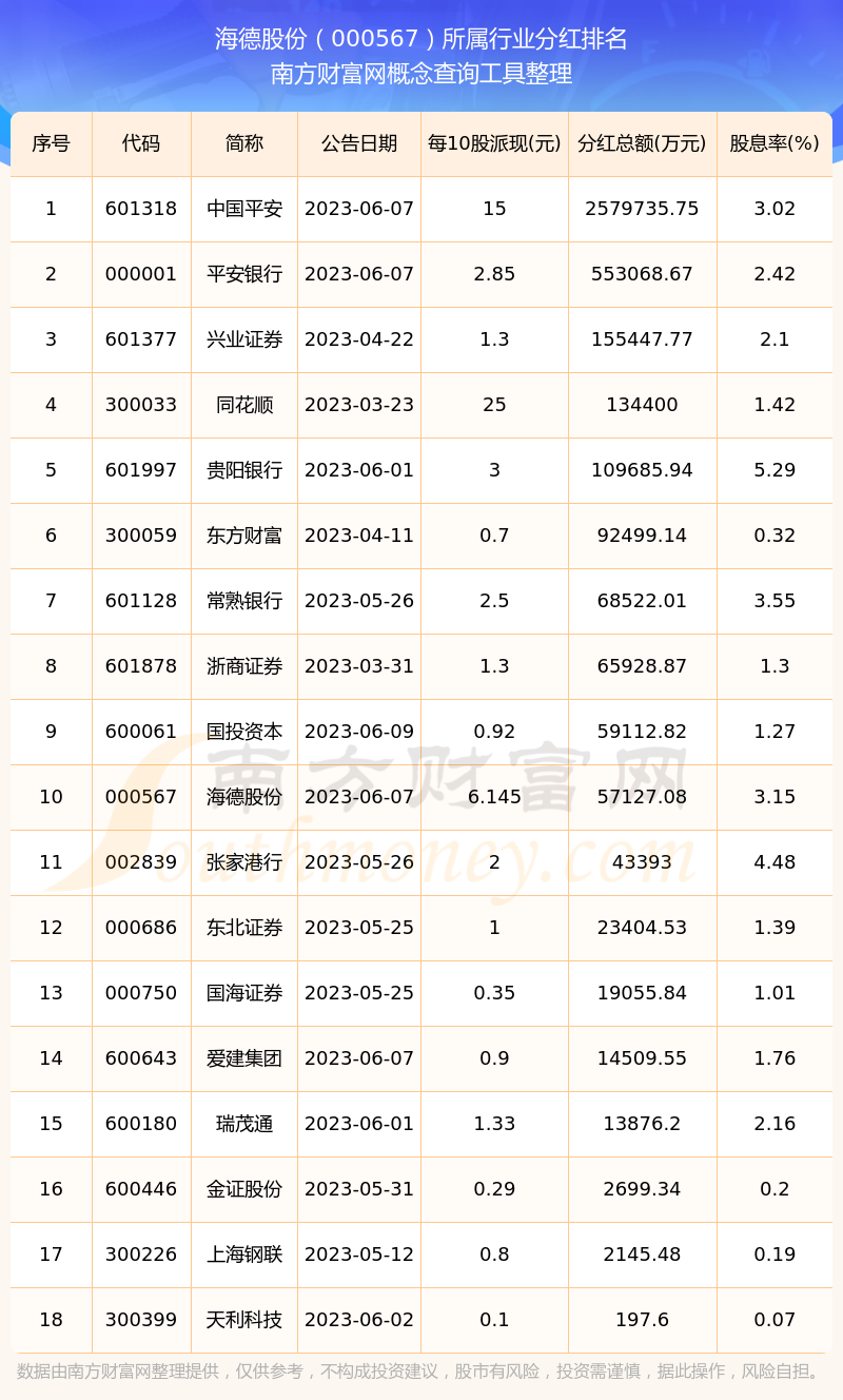 二、海德股份000567行業(yè)分紅排名