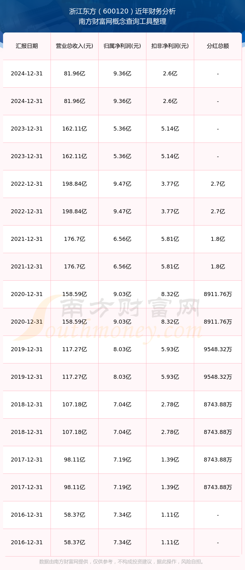 2024年浙江東方總營收81.96億,同比增長-49.44%;凈利潤9.36億,同比增長74.84%;銷售毛利率5.47%。