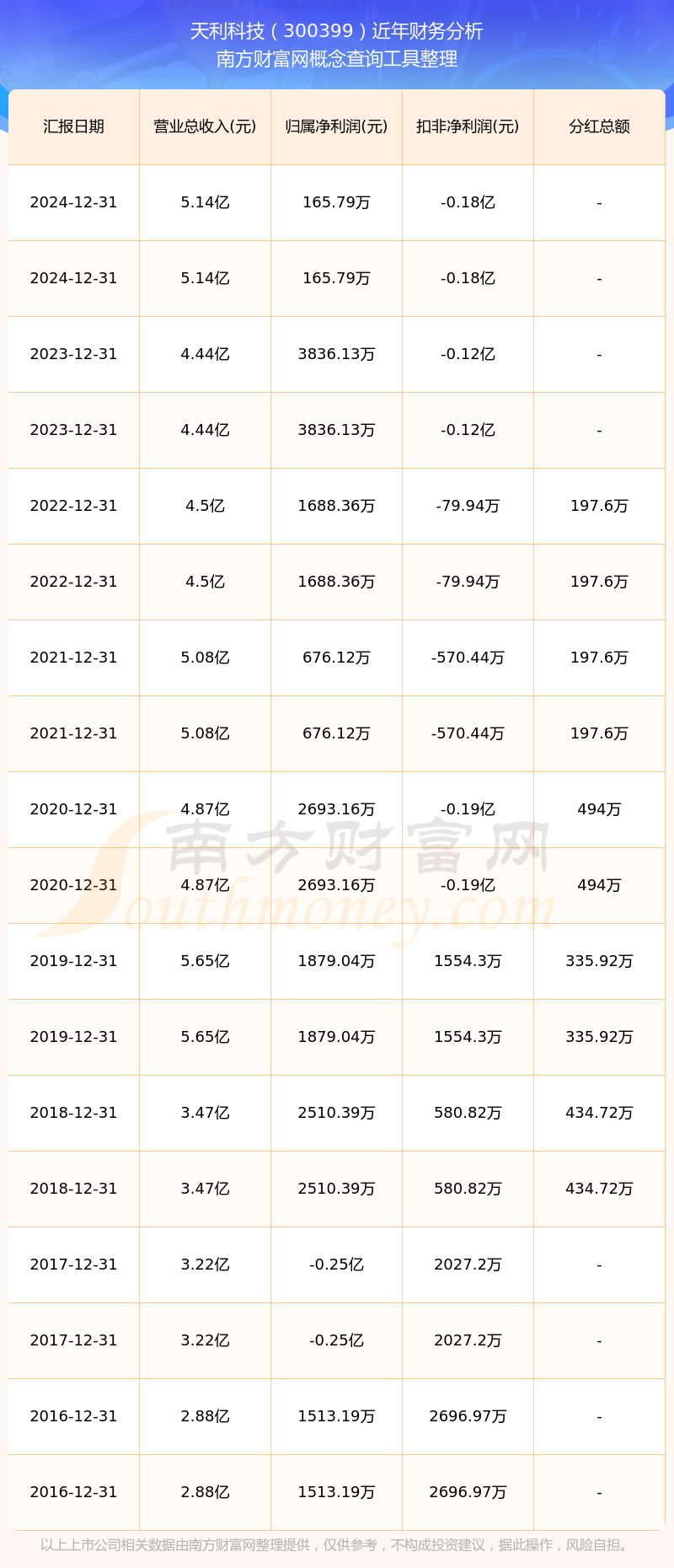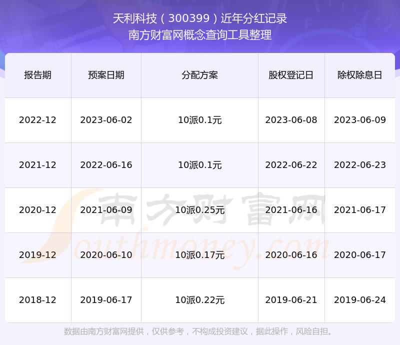 近年天利科技分紅派息情況如下表所示: