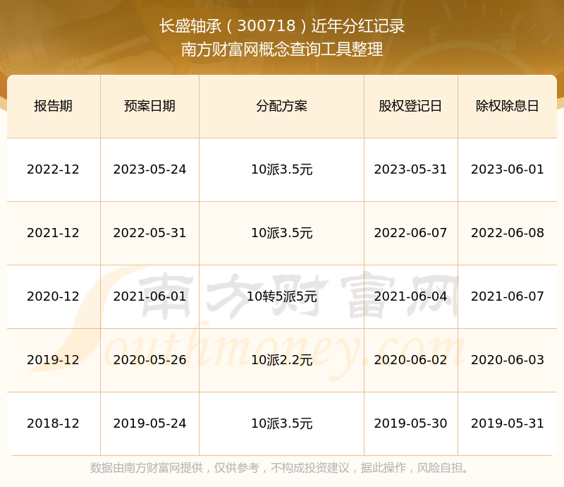 長盛軸承最新一次公布的分紅方案為10派3.5元。本次權(quán)益分派股權(quán)登記日為2023年5月31日,除權(quán)除息日為2023年6月1日,派息日為2023年6月1日。