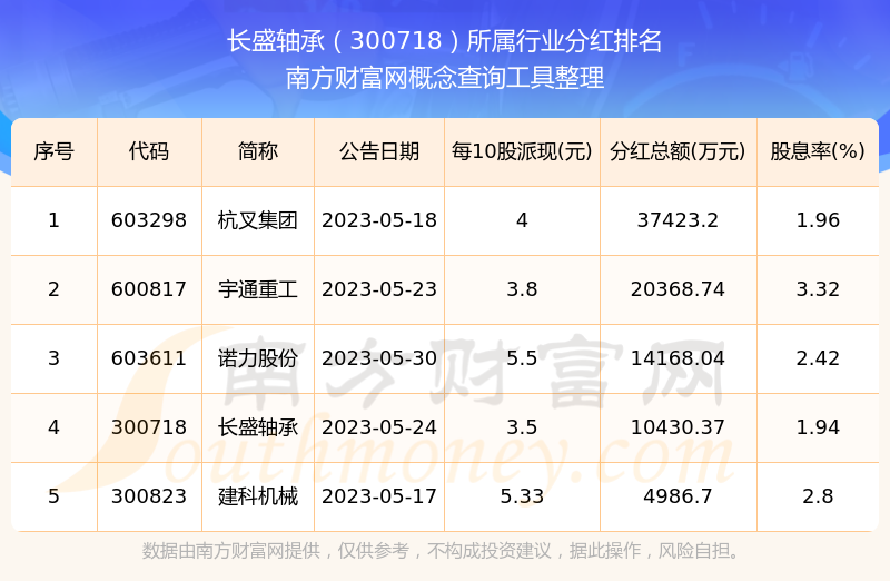 按照南方財富網(wǎng)趨勢選股系統(tǒng)統(tǒng)計,長盛軸承所屬行業(yè)為工程機(jī)械行業(yè),工程機(jī)械行業(yè)分紅排名情況如下表: