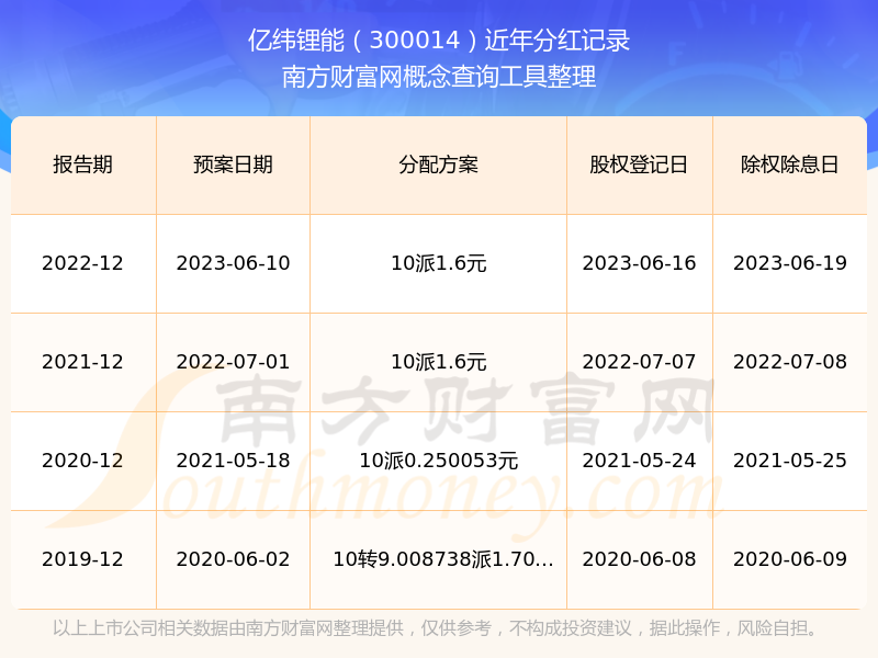 億緯鋰能最新一次公布的分紅方案為10派1.6元。本次權(quán)益分派股權(quán)登記日為2023年6月16日,除權(quán)除息日為2023年6月19日,派息日為2023年6月19日。