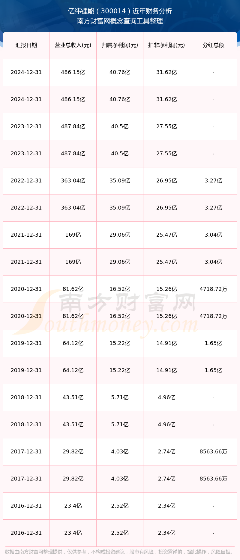 億緯鋰能2024年總營(yíng)收486.15億,同比增長(zhǎng)-0.35%;凈利潤(rùn)40.76億,同比增長(zhǎng)0.63%;銷售毛利率17.41%。
