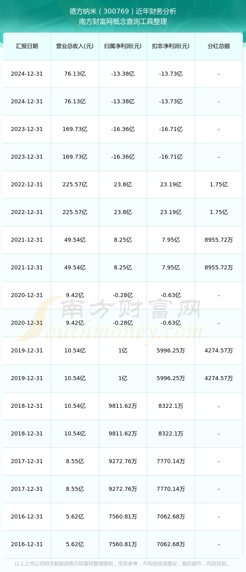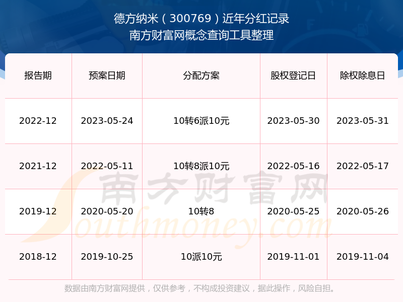 德方納米歷年分紅派息情況如下表所示: