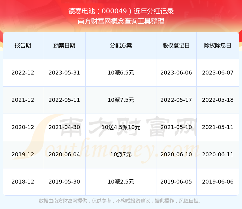 德賽電池最新一次公布的分紅方案為10派6.5元。本次權(quán)益分派股權(quán)登記日為2023年6月6日,除權(quán)除息日為2023年6月7日,派息日為2023年6月7日。