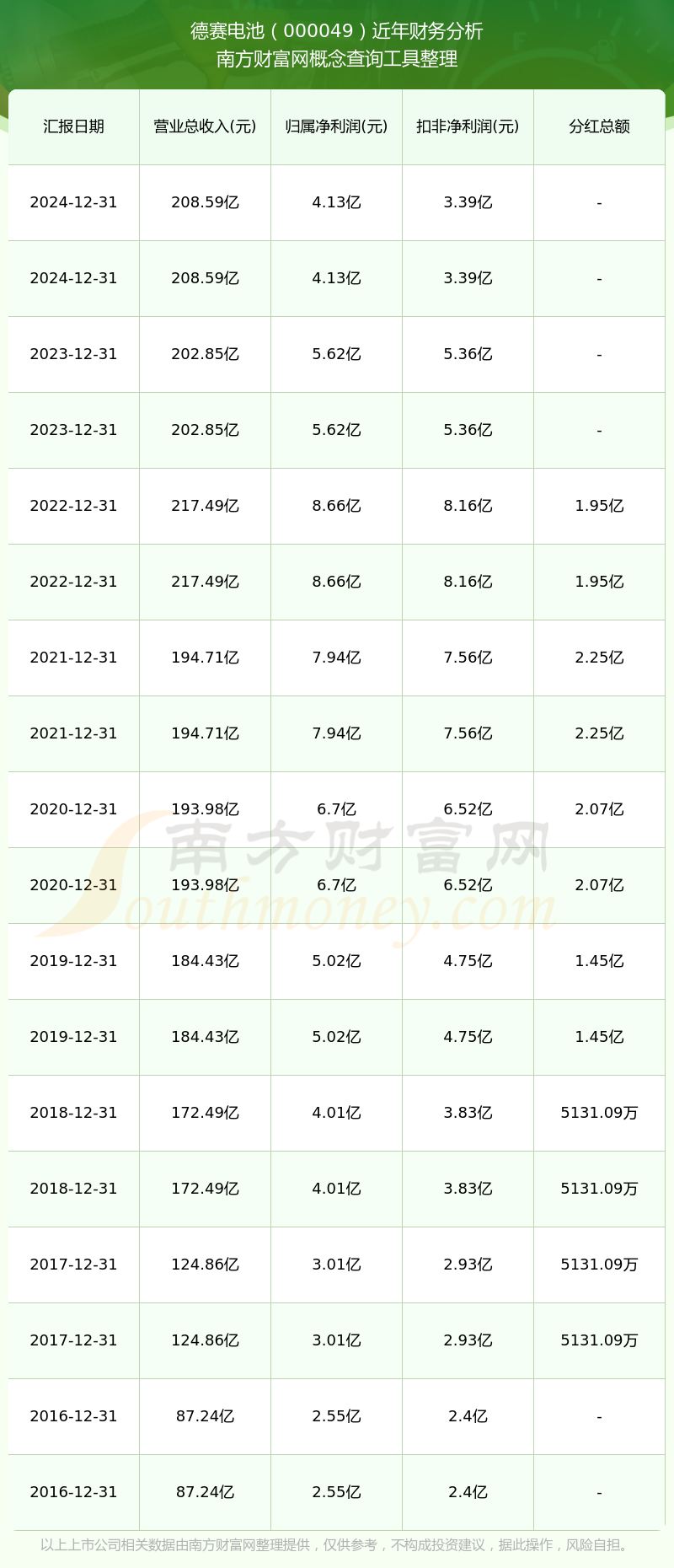 德賽電池歷年分紅派息情況如下表所示: