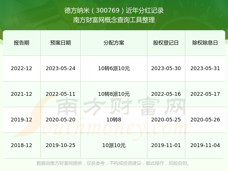 德方納米最新一次公布的分紅方案為10轉(zhuǎn)6派10元。本次權(quán)益分派股權(quán)登記日為2023年5月30日,除權(quán)除息日為2023年5月31日,派息日為2023年5月31日。