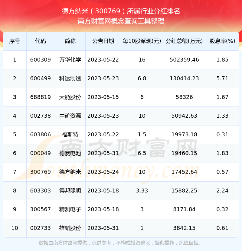 按照南方財(cái)富網(wǎng)趨勢(shì)選股系統(tǒng)統(tǒng)計(jì),德方納米所屬行業(yè)為納米磷酸鐵鋰行業(yè),納米磷酸鐵鋰行業(yè)分紅排名情況如下表: