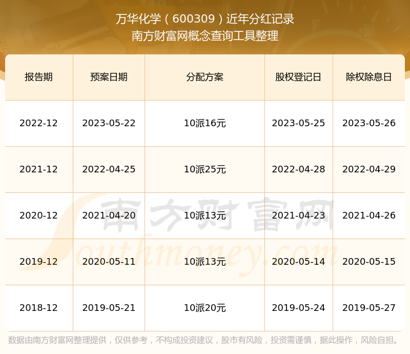 萬(wàn)華化學(xué)最新一次公布的分紅方案為10派16元。本次權(quán)益分派股權(quán)登記日為2023年5月25日,除權(quán)除息日為2023年5月26日,派息日為2023年5月26日。