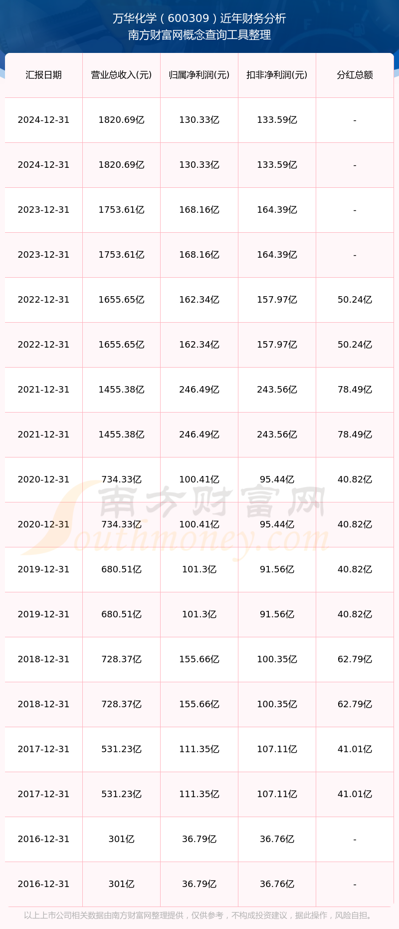 萬(wàn)華化學(xué)歷年分紅派息情況如下表所示: