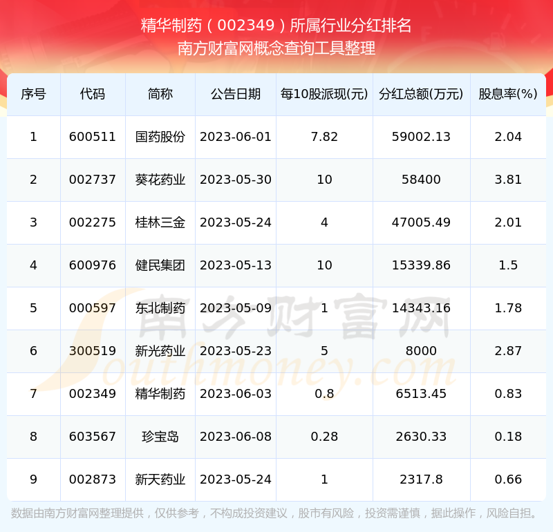按照南方財富網(wǎng)趨勢選股系統(tǒng)統(tǒng)計,精華制藥所屬行業(yè)為中藥行業(yè),中藥行業(yè)分紅排名情況如下表:
