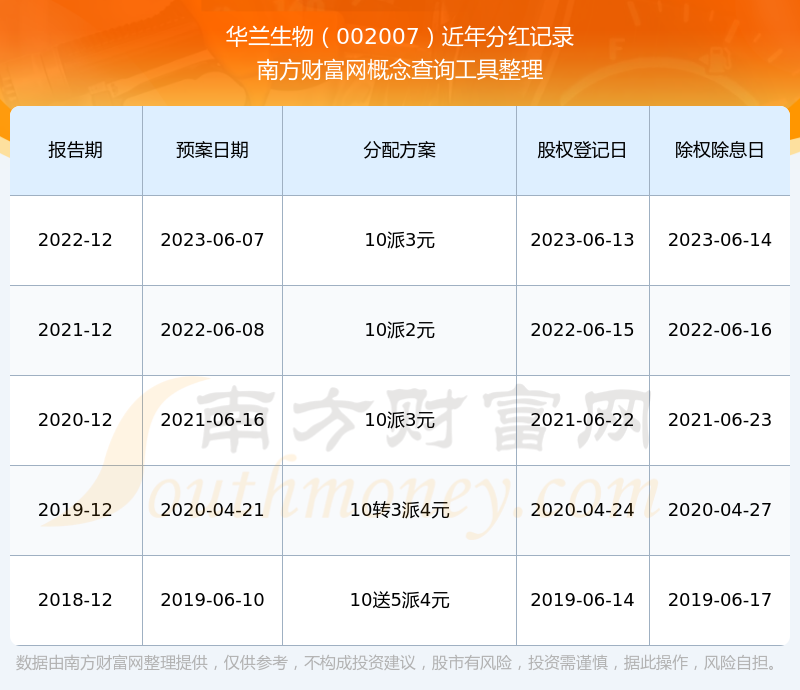 華蘭生物最新一次公布的分紅方案為10派3元。本次權(quán)益分派股權(quán)登記日為2023年6月13日,除權(quán)除息日為2023年6月14日,派息日為2023年6月14日。