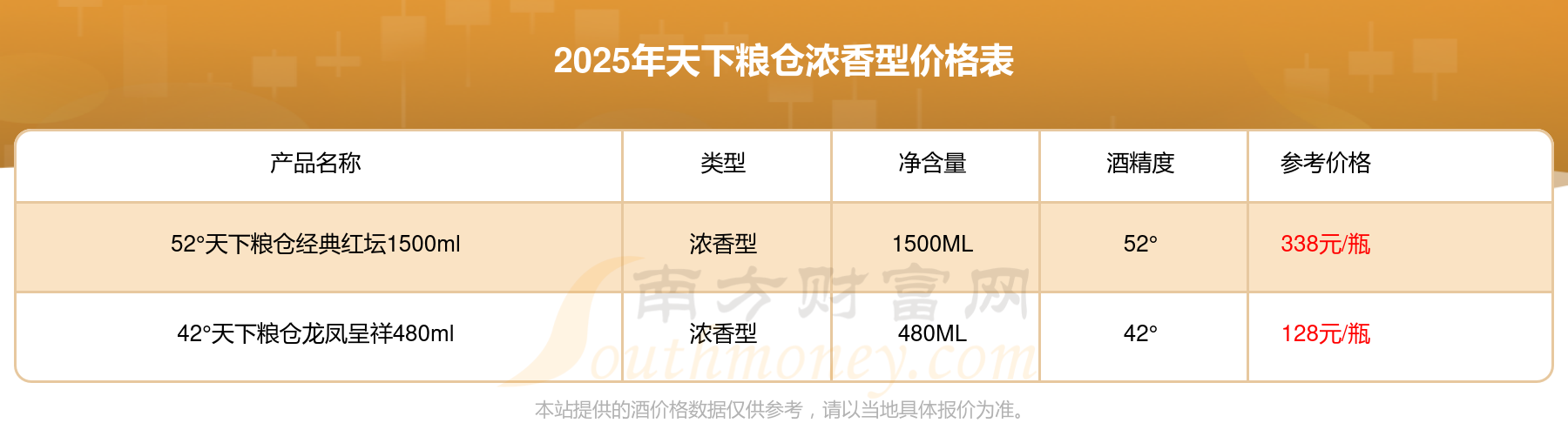 2025年,52°天下糧倉經(jīng)典紅壇1500ml、42°天下糧倉龍鳳呈祥480ml等天下糧倉濃香型酒價格如下:52°天下糧倉經(jīng)典紅壇1500ml參考價338元/瓶、42°天下糧倉龍鳳呈祥480ml參考價128元/瓶。