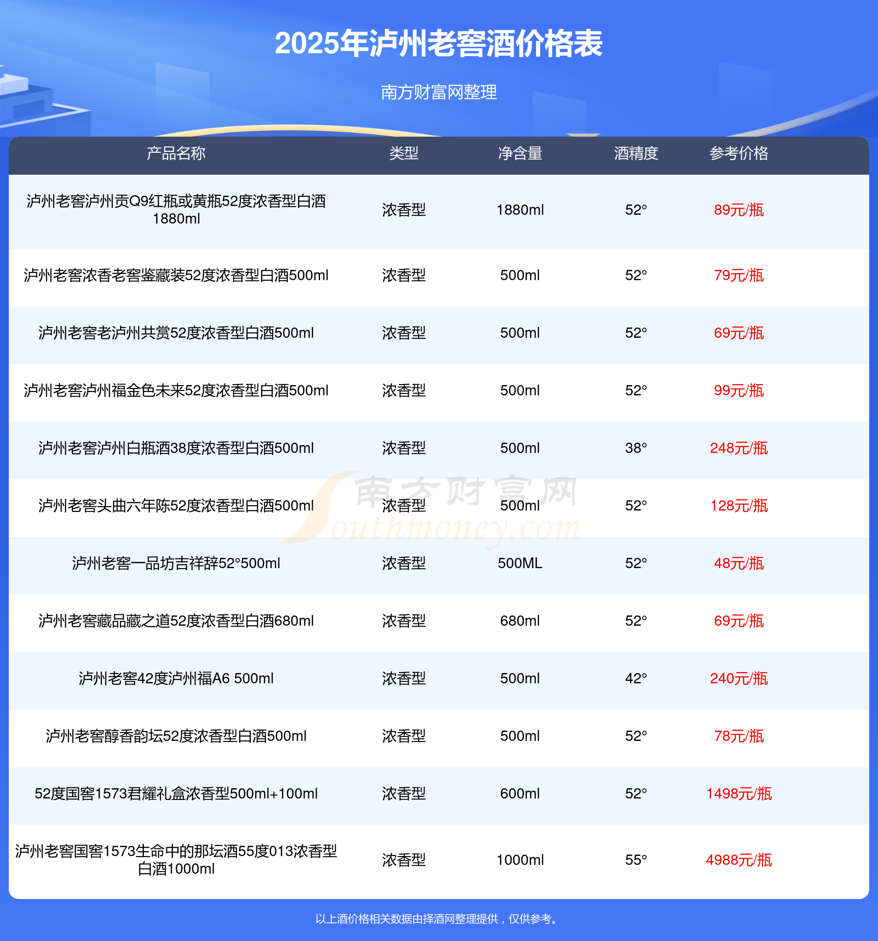 瀘州老窖國窖1573春釀鼠兆豐年E 55度參考價(jià)17999元/瓶、瀘州老窖國窖1573生命中的那壇酒55度014參考價(jià)9999元/瓶、瀘州老窖國窖1573春釀鼠兆豐年A 55度參考價(jià)5088元/瓶、瀘州老窖國窖1573生命中的那壇酒55度013濃香型白酒1000ml參考價(jià)4988元/瓶、瀘州老窖國窖1573生命中的那壇酒55度009 1000ml參考價(jià)4288元/瓶。