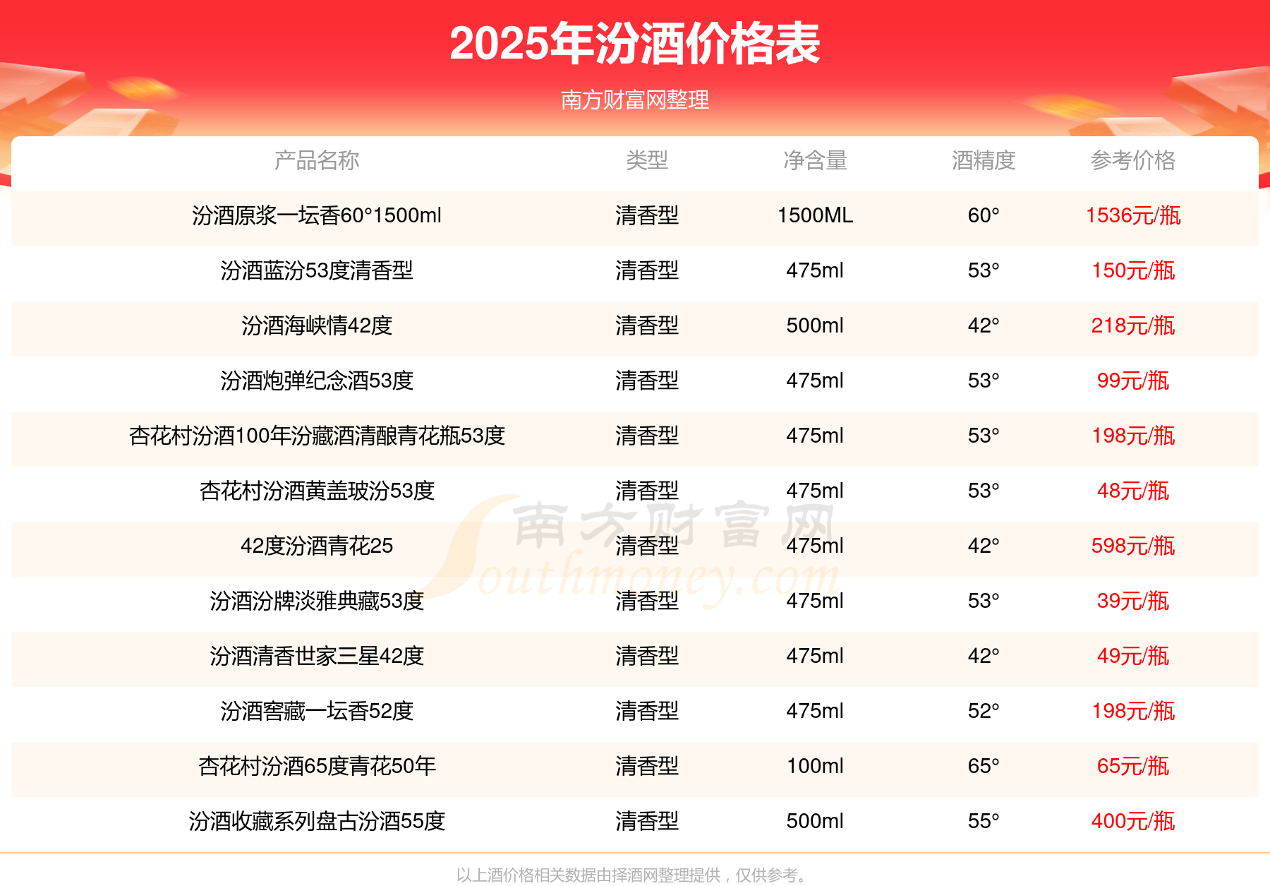 2025汾酒最新價(jià)格:汾酒原漿一壇香60°3000ml參考價(jià)2180元/瓶、汾酒原漿一壇香60°1500ml參考價(jià)1536元/瓶、42度汾酒青花25參考價(jià)598元/瓶、汾酒收藏系列盤(pán)古汾酒55度參考價(jià)400元/瓶、汾酒關(guān)照原漿60度參考價(jià)399元/瓶、汾酒青花20單瓶禮盒裝參考價(jià)388元/瓶、汾酒海峽情42度參考價(jià)218元/瓶、汾酒窖藏一壇香52度參考價(jià)198元/瓶。