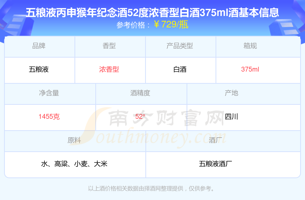 五糧液丙申猴年紀(jì)念酒52度濃香型白酒375ml基本信息