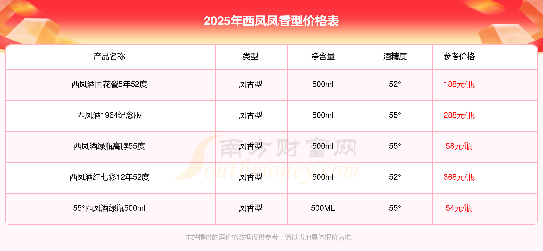 2025年西鳳鳳香型酒西鳳酒紅七彩12年52度、西鳳酒1964紀(jì)念版、西鳳酒國(guó)花瓷5年52度等最新價(jià)格如下: