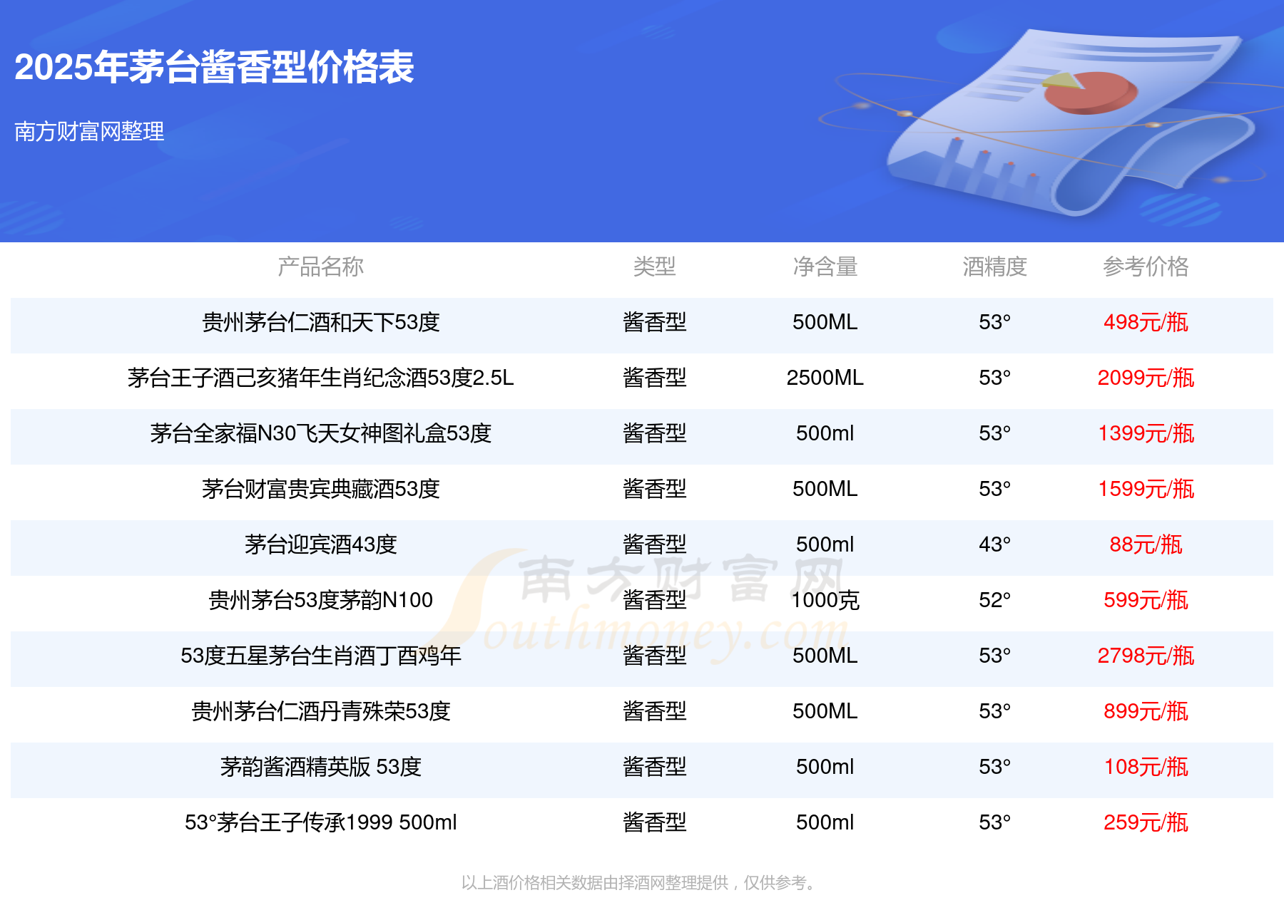 2025年茅臺醬香型價格最高的酒是華茅鑒藏 醬香型白酒 3L 53°,參考價8388元/瓶,最低的是漢董酒陳釀酒53度,參考價79元/瓶,價格高低差為8309元/瓶。