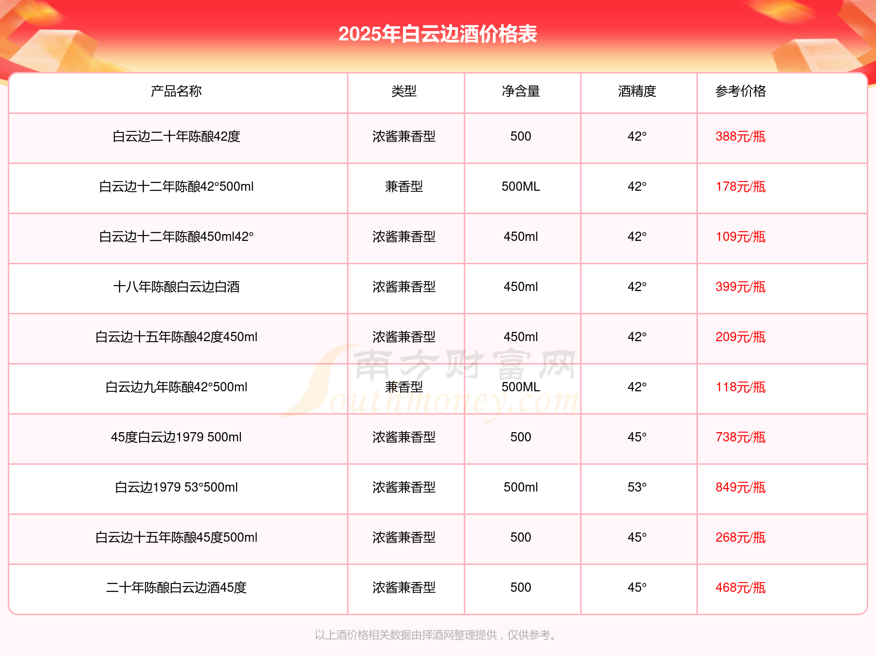 2025白云邊酒最新價格:白云邊1979 53°500ml參考價849元/瓶、45度白云邊1979 500ml參考價738元/瓶、二十年陳釀白云邊酒45度參考價468元/瓶、十八年陳釀白云邊白酒參考價399元/瓶、白云邊二十年陳釀42度參考價388元/瓶、白云邊十五年陳釀45度500ml參考價268元/瓶、白云邊十五年陳釀42度450ml參考價209元/瓶。