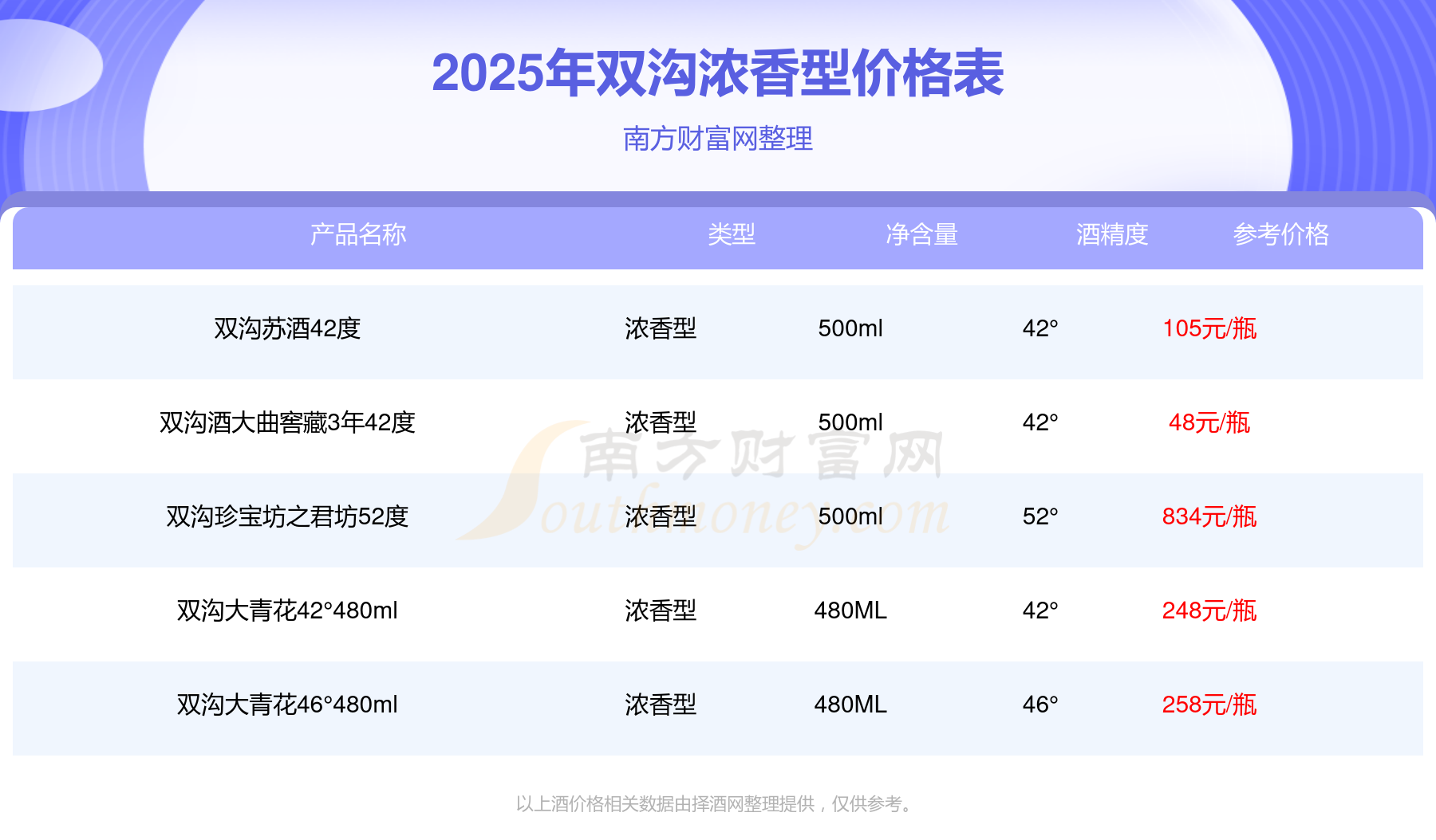 2025年,雙溝珍寶坊之君坊52度、雙溝大青花46°480ml、雙溝大青花42°480ml、雙溝蘇酒42度、雙溝酒大曲窖藏3年42度等雙溝濃香型酒價(jià)格如下:雙溝珍寶坊之君坊52度參考價(jià)834元/瓶、雙溝大青花46°480ml參考價(jià)258元/瓶、雙溝大青花42°480ml參考價(jià)248元/瓶、雙溝蘇酒42度參考價(jià)105元/瓶、雙溝酒大曲窖藏3年42度參考價(jià)48元/瓶。